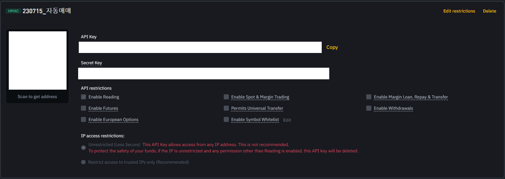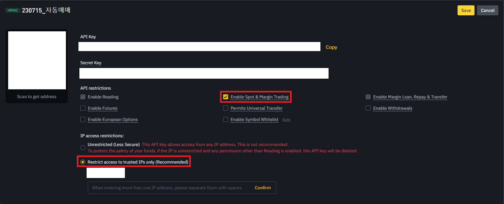 그러면 아래처럼 기능들을 선택할 수 있고, 저는 현물 거래만 할거라 우선 Enable Spot & Margin Trading만 체크했습니다.