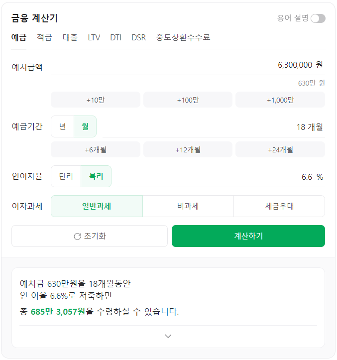 위 사진에서 확인할 수 있듯이 이는 일반과세 기준 연 6.6%, 비과세 기준 연 5.6%의 예금이자와 동일하다.