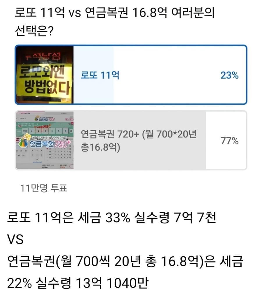 단순히 실수령액만 따지면 연금복권이 거의 1.7배에 가까우니 당연히 이득인것같지만
