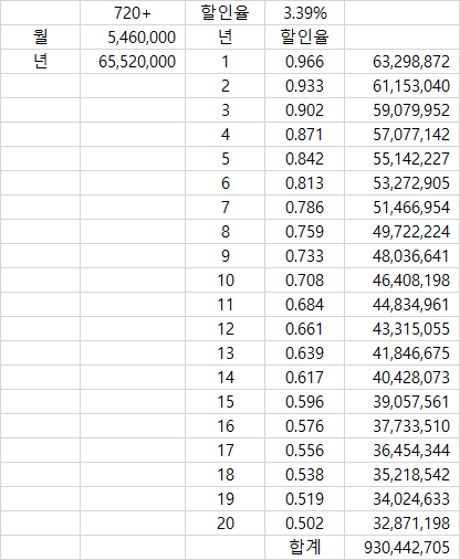 현재 한국 20년물 채권 수익률이 3.39%정도이니 이를 적용해봅니다.
