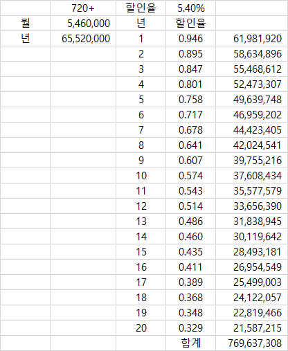 1. 20년에 걸쳐 받는 금액을 할인률 적용하기