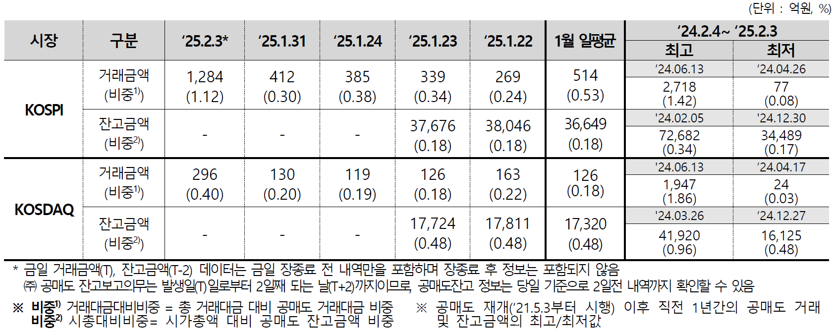 ◈ 2.3 장종료 기준 공매도 거래대금은 1,580억 원(KOSPI : 1,284억, KOSDAQ : 296억, 전체 거래대금 대비 약 0.84%)으로 전 거래일 대비 약 1,038억 원 증가하였습니다.