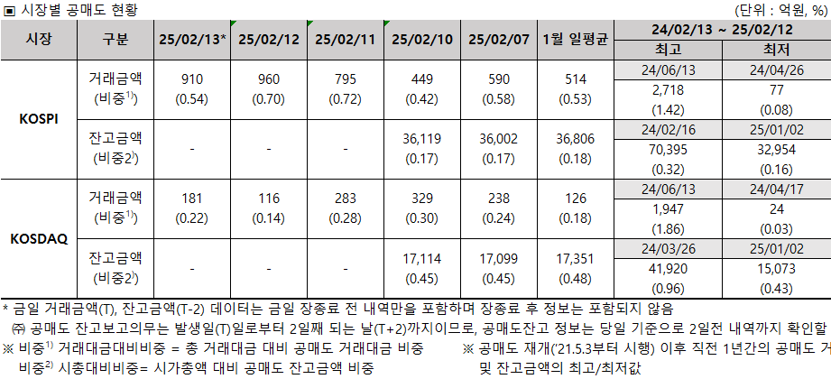 ◈ 02/13 장종료 기준 공매도 거래대금은 1,091억 원(전체 거래대금 대비 약 0.43%)으로 전 거래일 대비 약 15억 원 증가하였습니다.