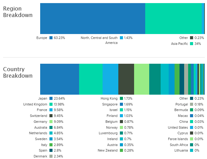 VEA의 상위 보유 종목에는 현금으로 추정되는 U.S Dollar가 1.75%로 가장 높은 비중을 차지하고 있다는 특징이 보입니다.