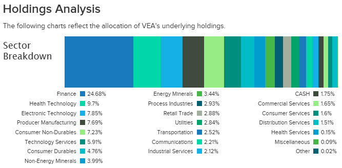업종별로는 금융이 VEA는 24.68%, IEFA는 24.74%로 가장 큰 비중을 차지하고 있는 모습입니다.