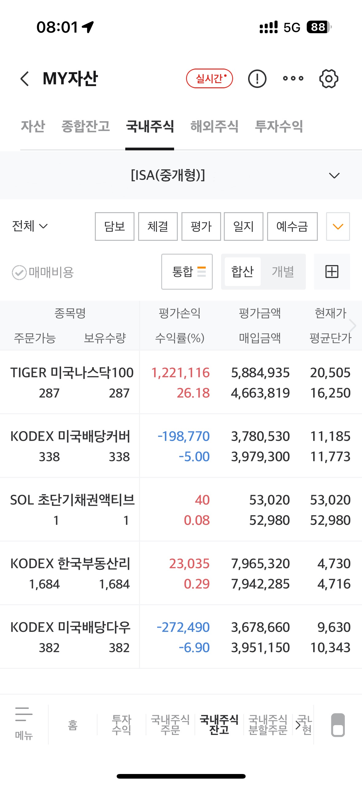 아래는 제가 운용중이던 ISA 계좌인데, 한동안 고배당주를 들고 있다가 최근 급락장에서 나스닥 레버리지로 일부 종목을 교체했습니다. 그리고 이번에는 금/은 롱숏 전략으로 또 한 번 종목을 교체하게 되었습니다.
