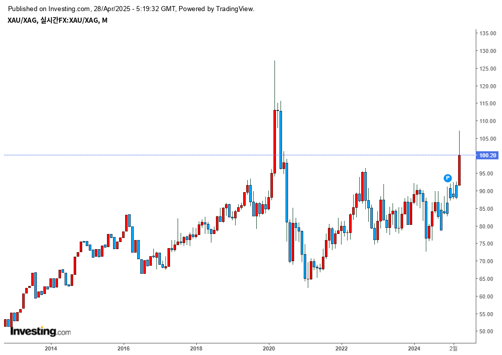 금은비란 금값과 은값의 비율로, 현재 금 1온스는 약 $3,300, 은 1온스는 약 $33로 금은비는 3,300 / 33 = 100정도로 계산됩니다.