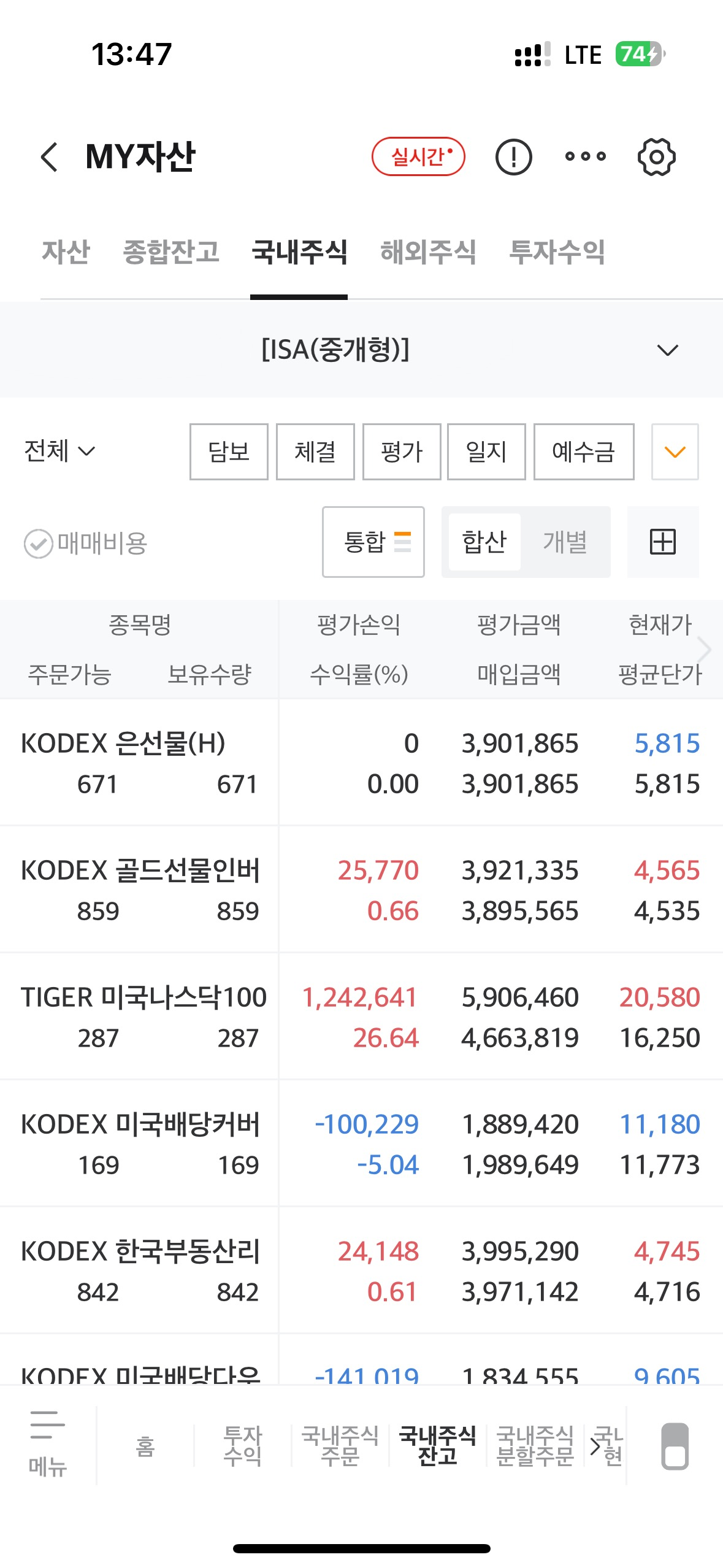 아래는 제가 운용중이던 ISA 계좌인데, 한동안 고배당주를 들고 있다가 최근 급락장에서 나스닥 레버리지로 일부 종목을 교체했습니다. 그리고 이번에는 금/은 롱숏 전략으로 또 한 번 종목을 교체하게 되었습니다.