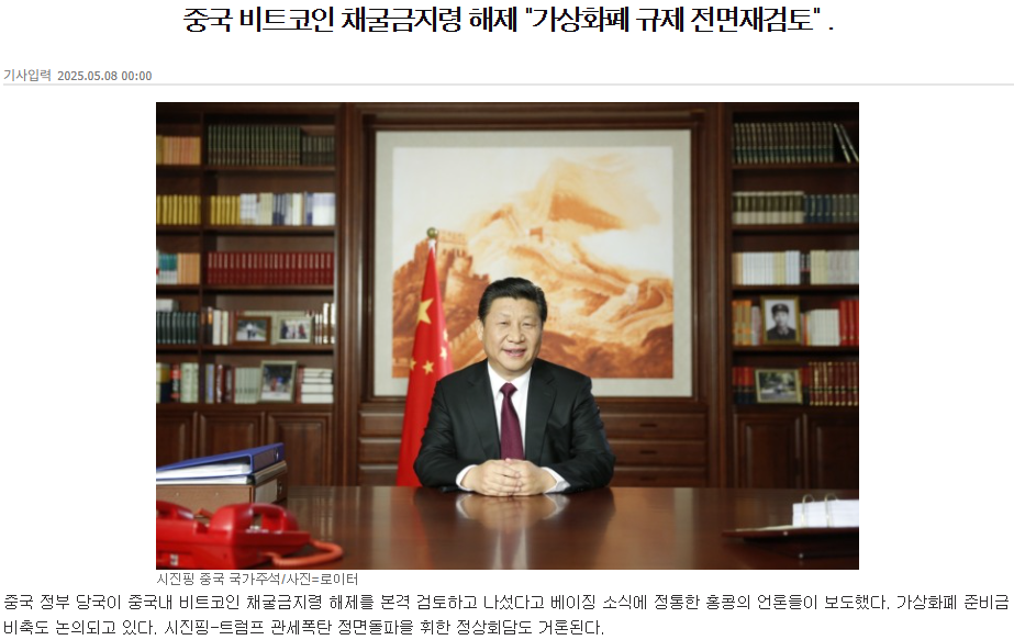 5월 8일즈음 중국이 비트코인 채굴 금지령을 해제한다는 찌라시가 돌면서 비트코인 가격이 100k를 돌파했었습니다.