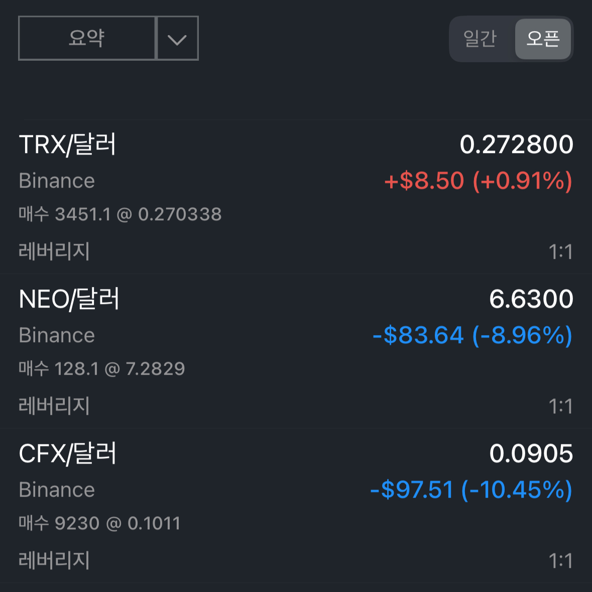 또한 중국과 연관된 코인 역시 큰 폭의 상승이 있을 것으로 예상해 GPT에게 관련 종목을 문의한 결과 TRX, NEO, CFX를 추천받았습니다. 추가 조사를 생략한 채 바로 매수했지만, 예상대로 가격은 다시 하락하고 말았습니다…