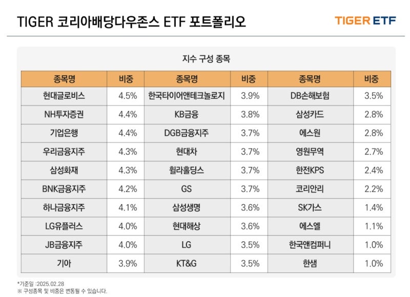 'TIGER 코리아배당다우존스'는 다우존스 미국 배당 100 지수 전략을 국내 증시에 적용해 고배당 30개 종목에 투자합니다. 배당수익률 상위 종목을 대상으로 펀더멘털(부채 대비 현금흐름·자기자본이익률·배당수익률·5년 배당성장률) 종합 점수를 계산한 후 상위 30개 종목을 선정합니다.