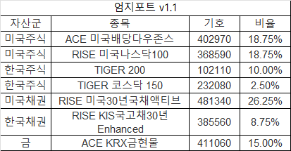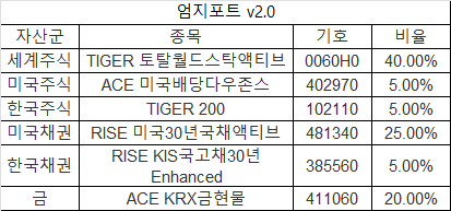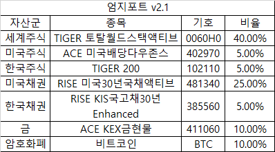 하지만 제 포트폴리오를 따라하고싶어하는 독자분들이 있고, 마침 좋은 ETF가 상장되어 엄지포트 v2.0를 만들어보았습니다.