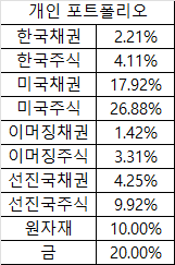 그리고 개인 포트폴리오의 한국주식, 미국주식은 레버리지 상품도 포함되어있습니다.