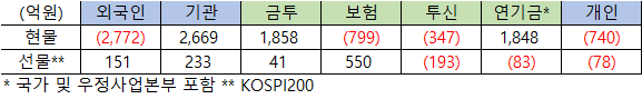 ○ 외국인(억원) : 운송장비·부품 -1,796, 금융 -515, 화학 -243