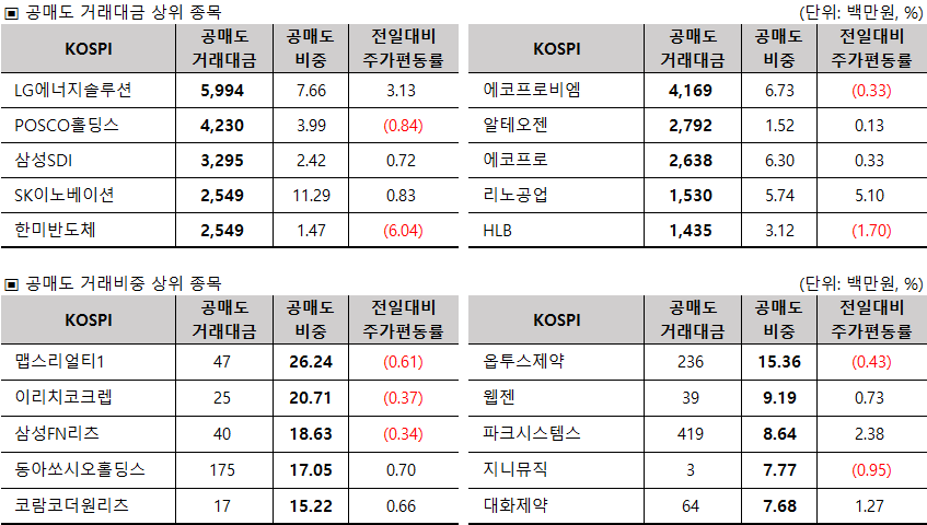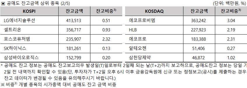 ◈ 02/10 장종료 기준 공매도 거래대금은 770억 원(전체 거래대금 대비 약 0.38%)으로 전 거래일 대비 약 58억 원 감소하였습니다.