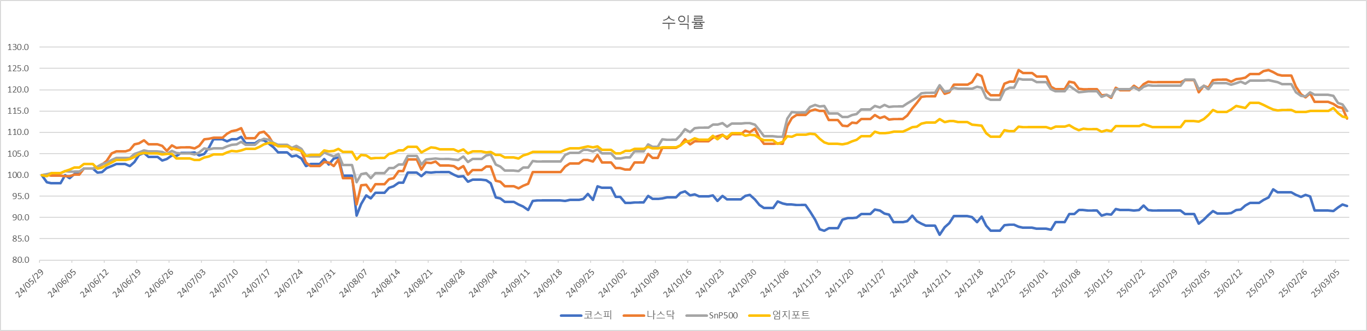 한번 한국과 미국을 대표하는 지수인 코스피, 나스닥, SnP500 지수와 엄지포트의 수익률을 비교해보겠습니다.